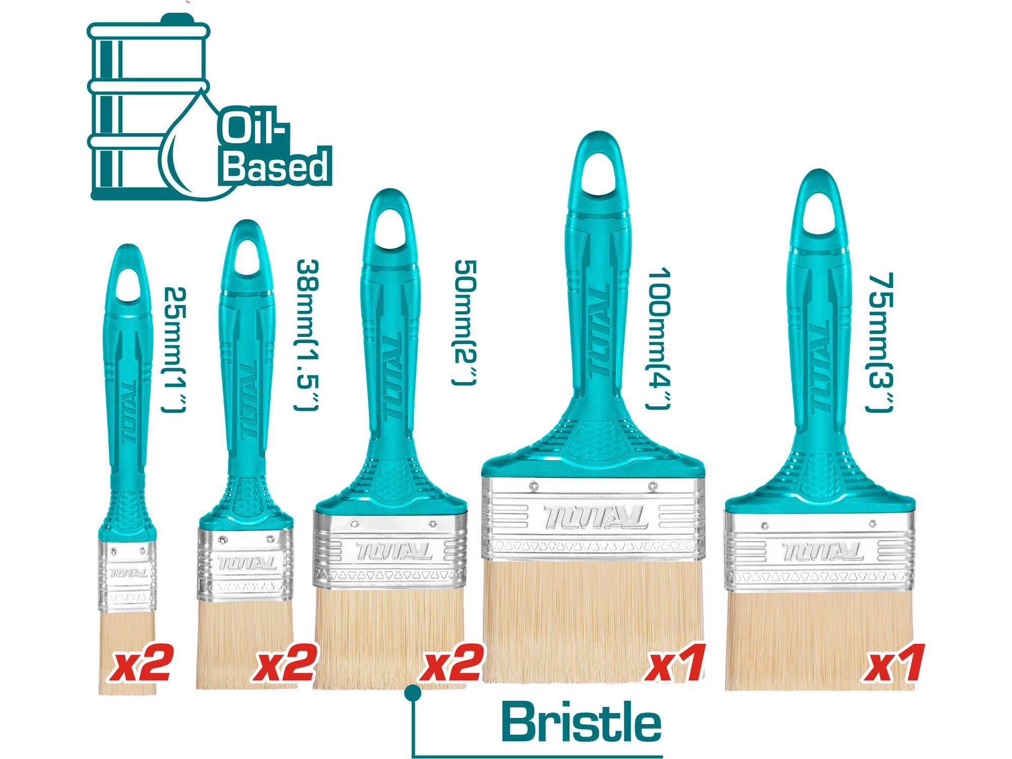 - 2 pędzle o szerokości 25 mm. Idealne do małych detali i trudno dostępnych miejsc. - 2 pędzle o szerokości 38 mm. Odpowiednie do średnich powierzchni i ogólnych projektów malarskich. - 2 pędzle o szerokości 50 mm. Idealne do większych powierzchni i szerokich pociągnięć. - 1 pędzel o szerokości 75 mm. Idealny do malowania dużych powierzchni. - 1 pędzel o szerokości 100 mm. Idealny do bardzo dużych obszarów i powierzchni wymagających szerokiego pokrycia.Niezależnie od tego, czy jesteś profesjonalnym malarzem, czy entuzjastą majsterkowania, ten zestaw pędzli oferuje wszechstronność, której potrzebujesz, aby Twój projekt zakończył się sukcesem.